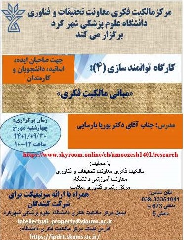 به استحضار می رساند کارگاه آموزشی "مبانی مالکیت فکری" به صورت وبیناری، در روز چهارشنبه مورخ 30 آذر ماه 1401 راس ساعت 10 الی 12 ویژه صاحبان ایده، اساتید، دانشجویان و کارمندان عاقمه مند به حوزه مالکیت فکری و ثبت اختراع توسط مرکز مالکیت فکری معاونت تحقیقات و فناوری دانشگاه علوم پزشکی شهرکرد با تدریس آقای دکتر پوریا پارسایی برگزار خواهد ششد. علاقه مندان می توانند از طریق آدرس لینک https://www.skyroom.online/ch/amoozesh1401/research در کارگاه مذکور شرکت نمایند.