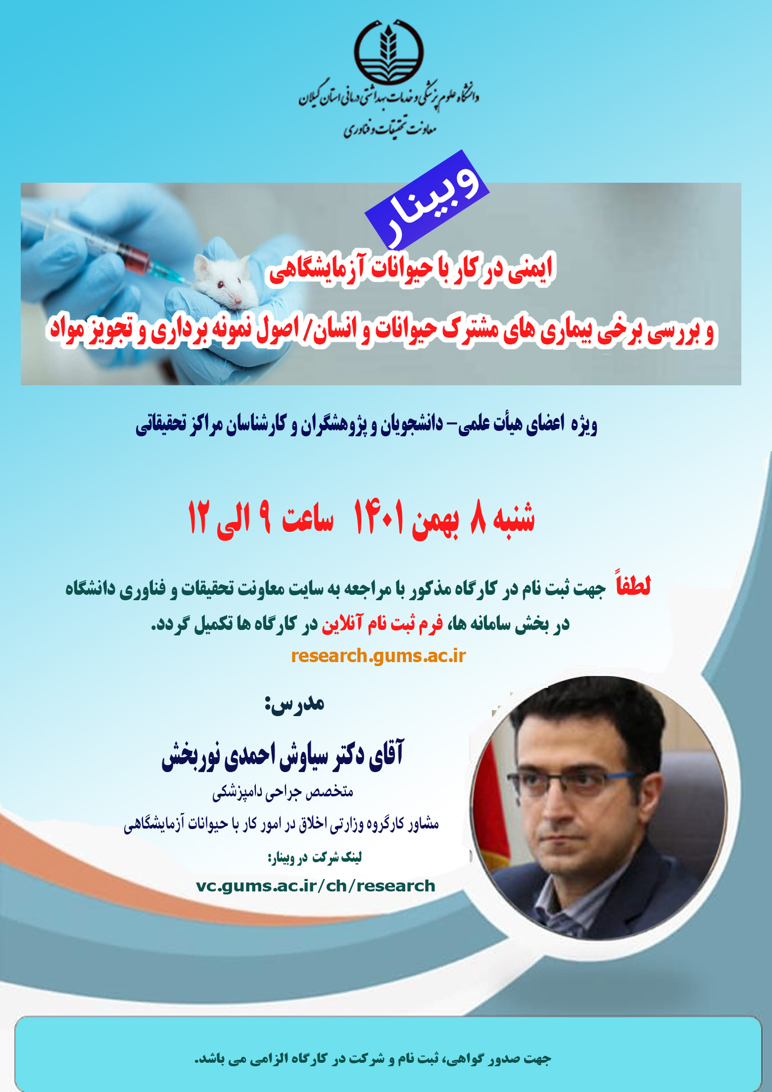 به پیوست پوستر و برنامه وبینار کارگاهی ایمنی در کار با حیوانات آزمایشگاهی جهت استحضار علاقه مندان قرار می گیرد.